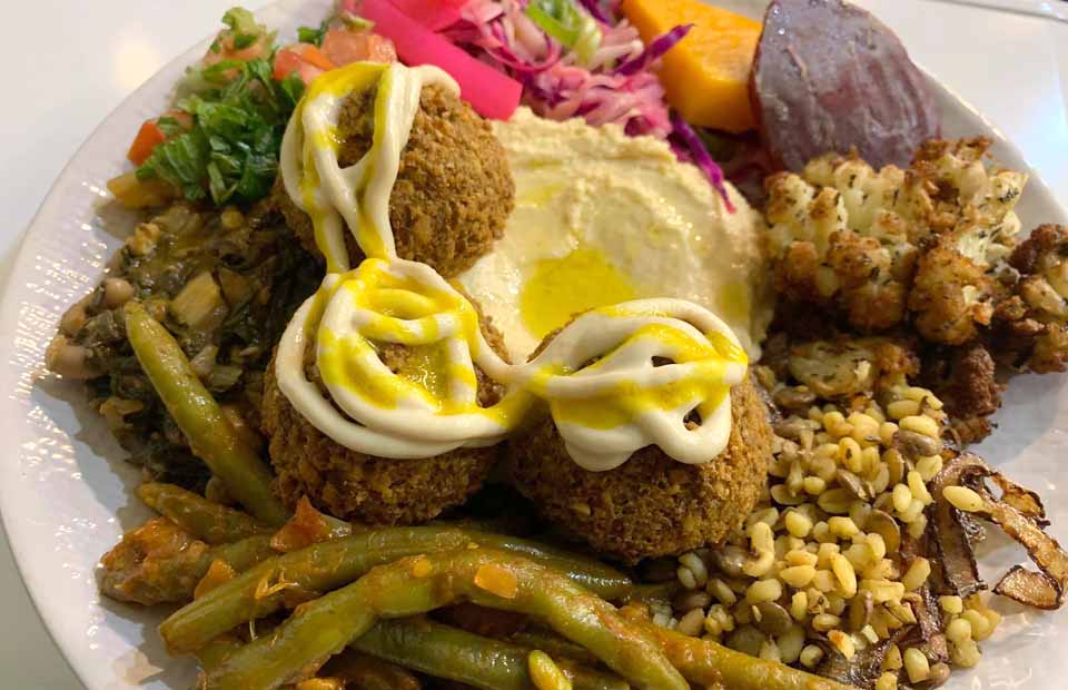 – w/ falafel, hummus, tabbouleh, cauliflower, pickles and tahini